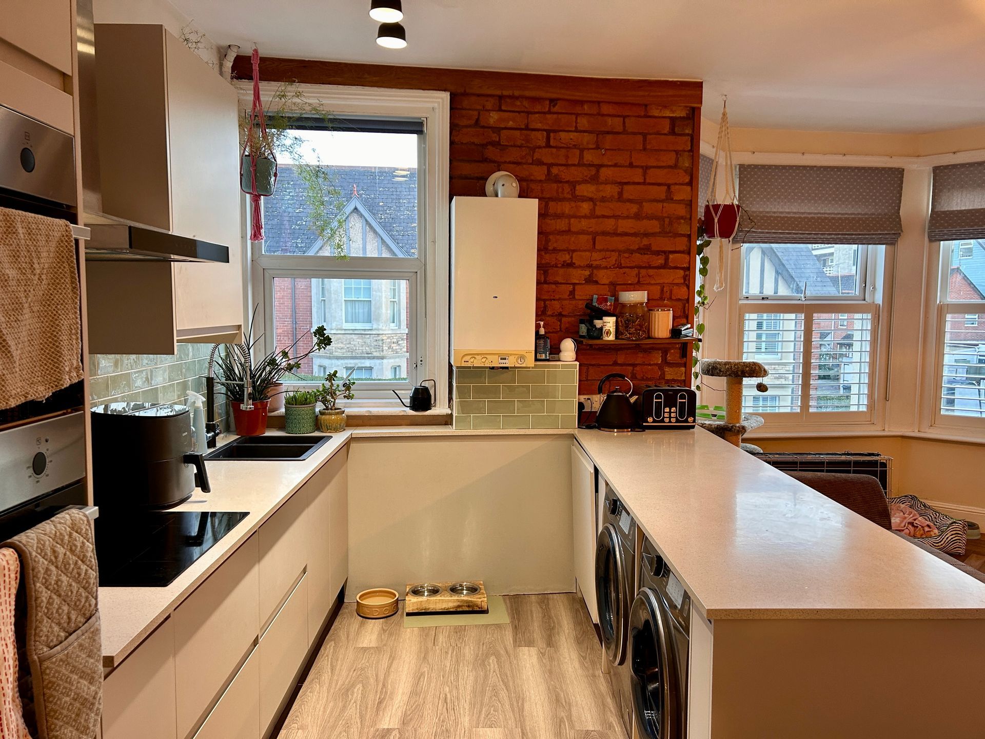 The kitchen/living room is bright and airy room. The living room has a large bay window, with half slats on the double glazed windows, a free standing gas fireplace with a chunky wooden surround and a black marble hearth.
