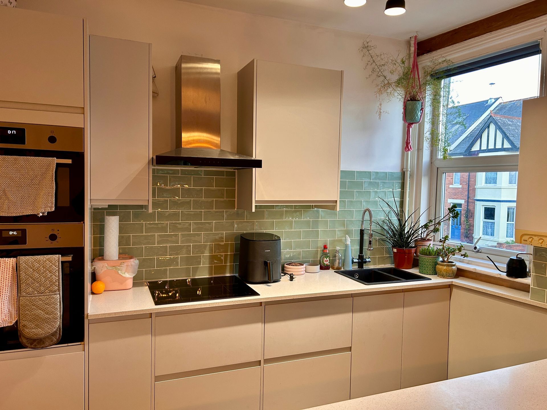 The kitchen has modern and stylish white base and wall units, a built-in induction hob with extractor over, really convenient eye level oven and microwave, black double sink with mixer tap, feature brick wall and large double glazed window. This is a great entertaining space.